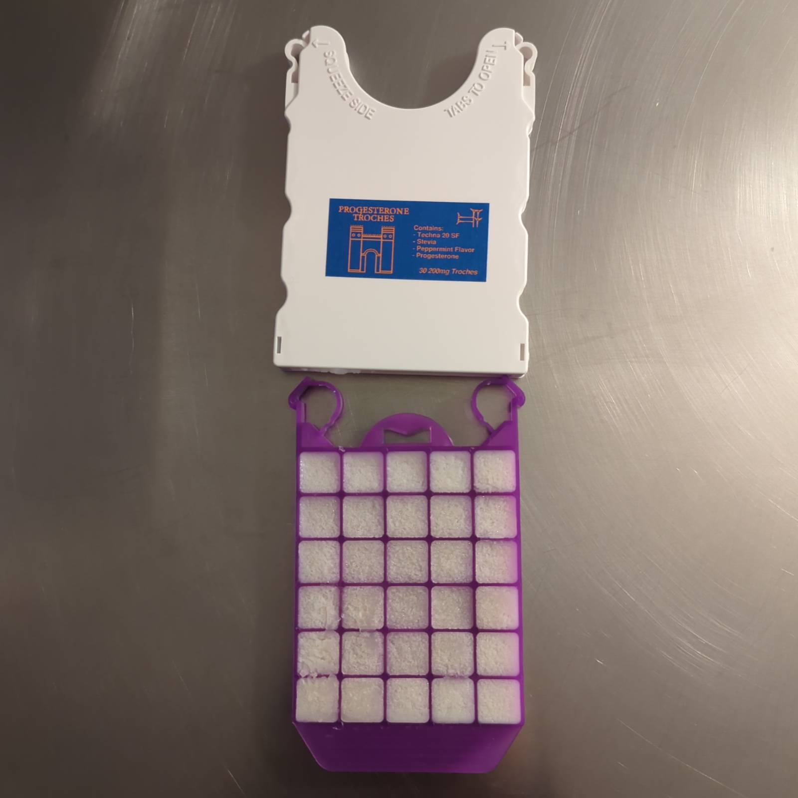 Troches allow for direct entry into the bloodstream by dissolving into your oral mucosa in your buccal region. This skips most digestion of your Progesterone without having to use a suppository. Comes in purple trays with a white holder.